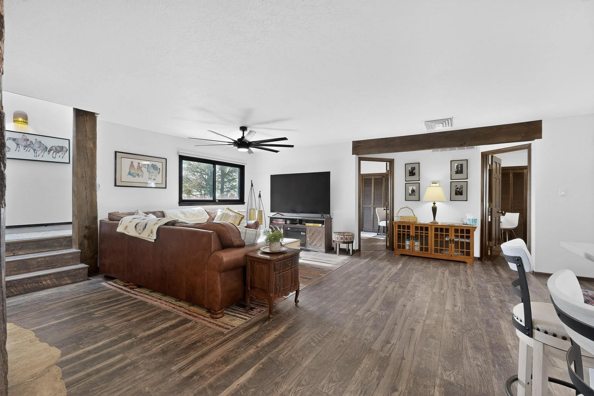 Large open family room including 75 Inch TCL 4K ULD TV for watching movies.