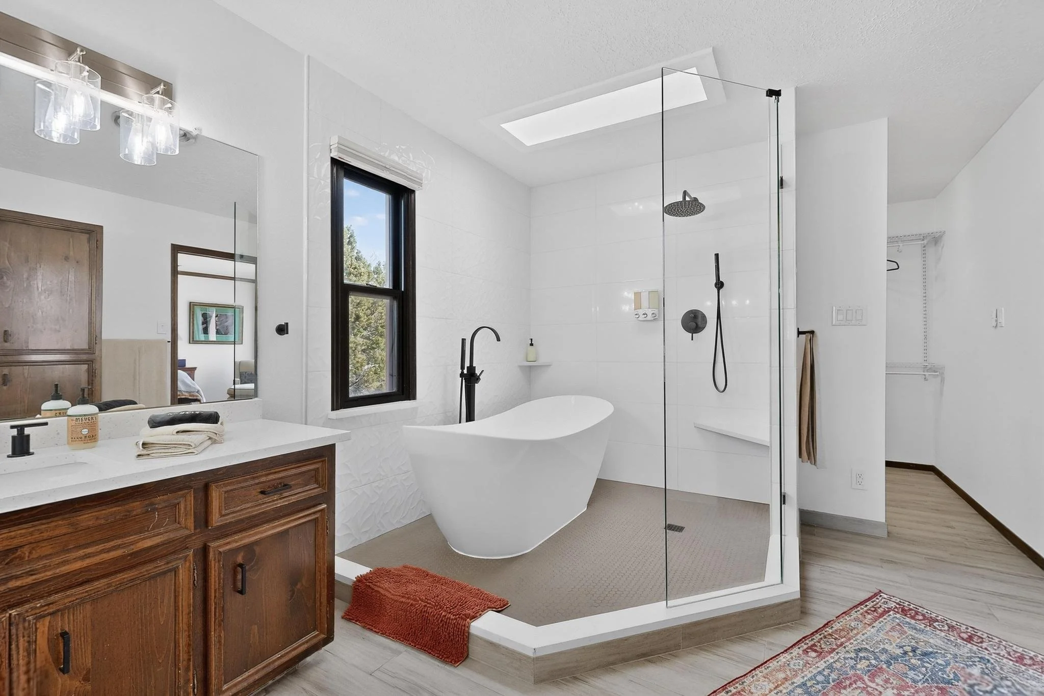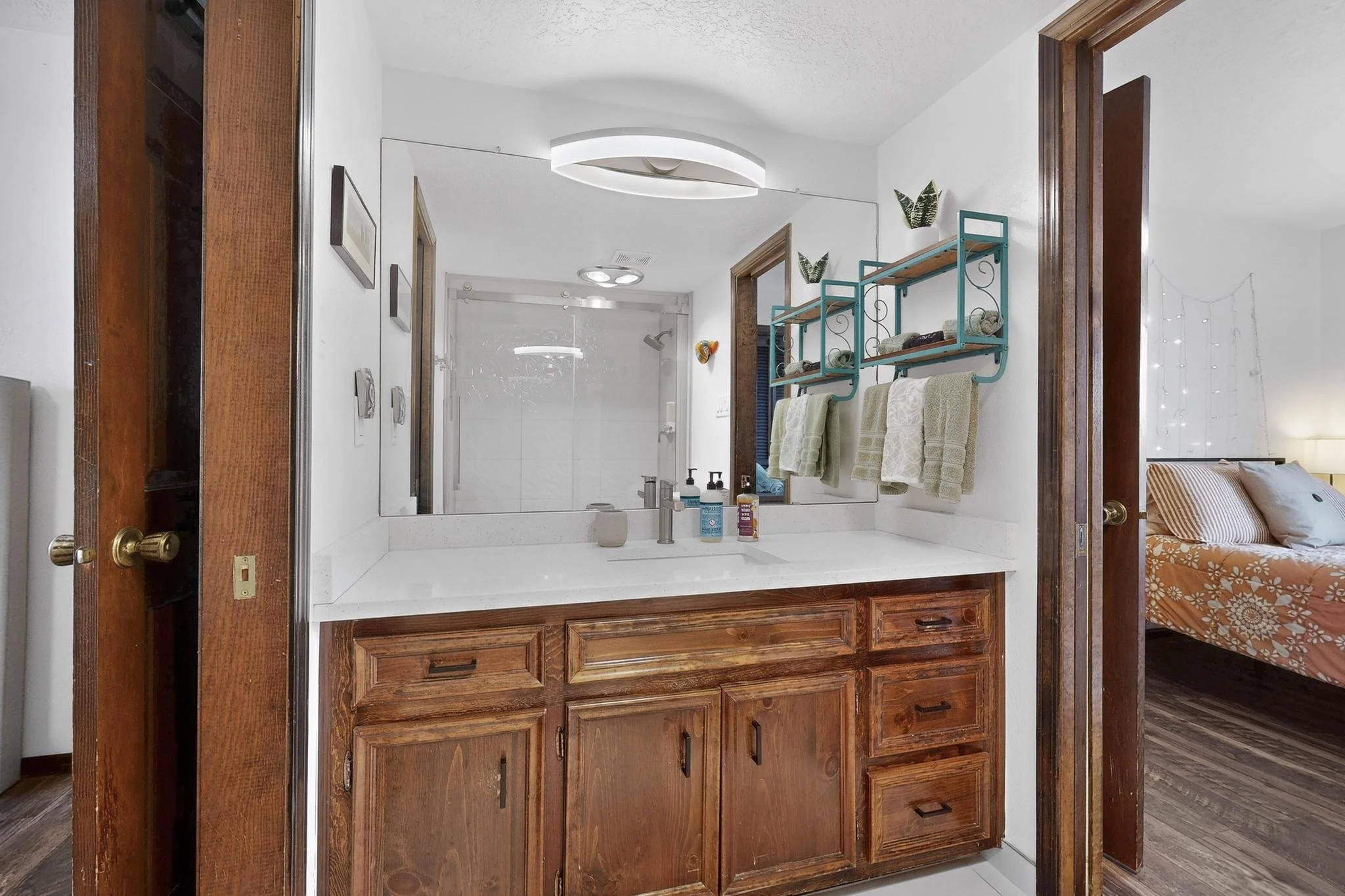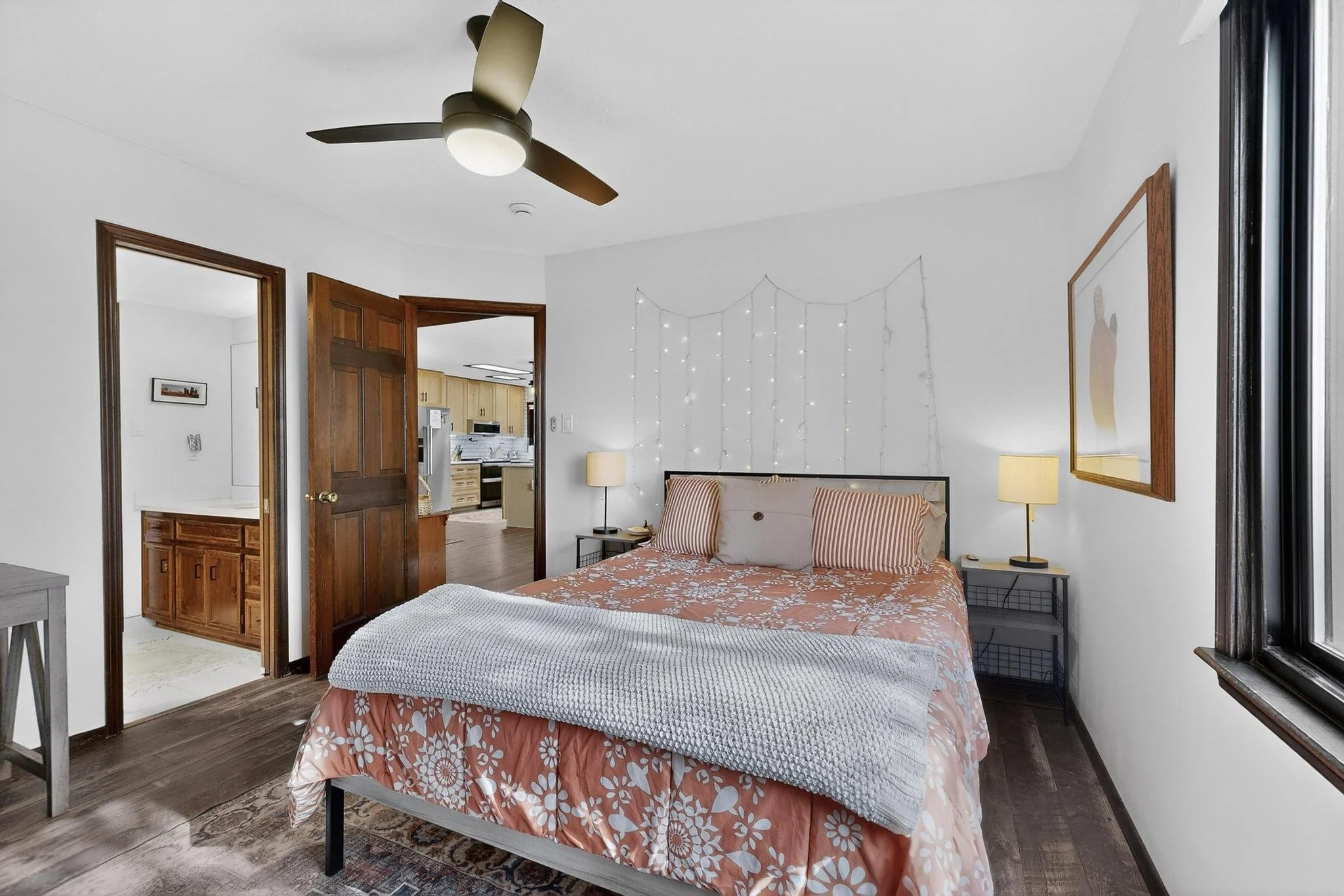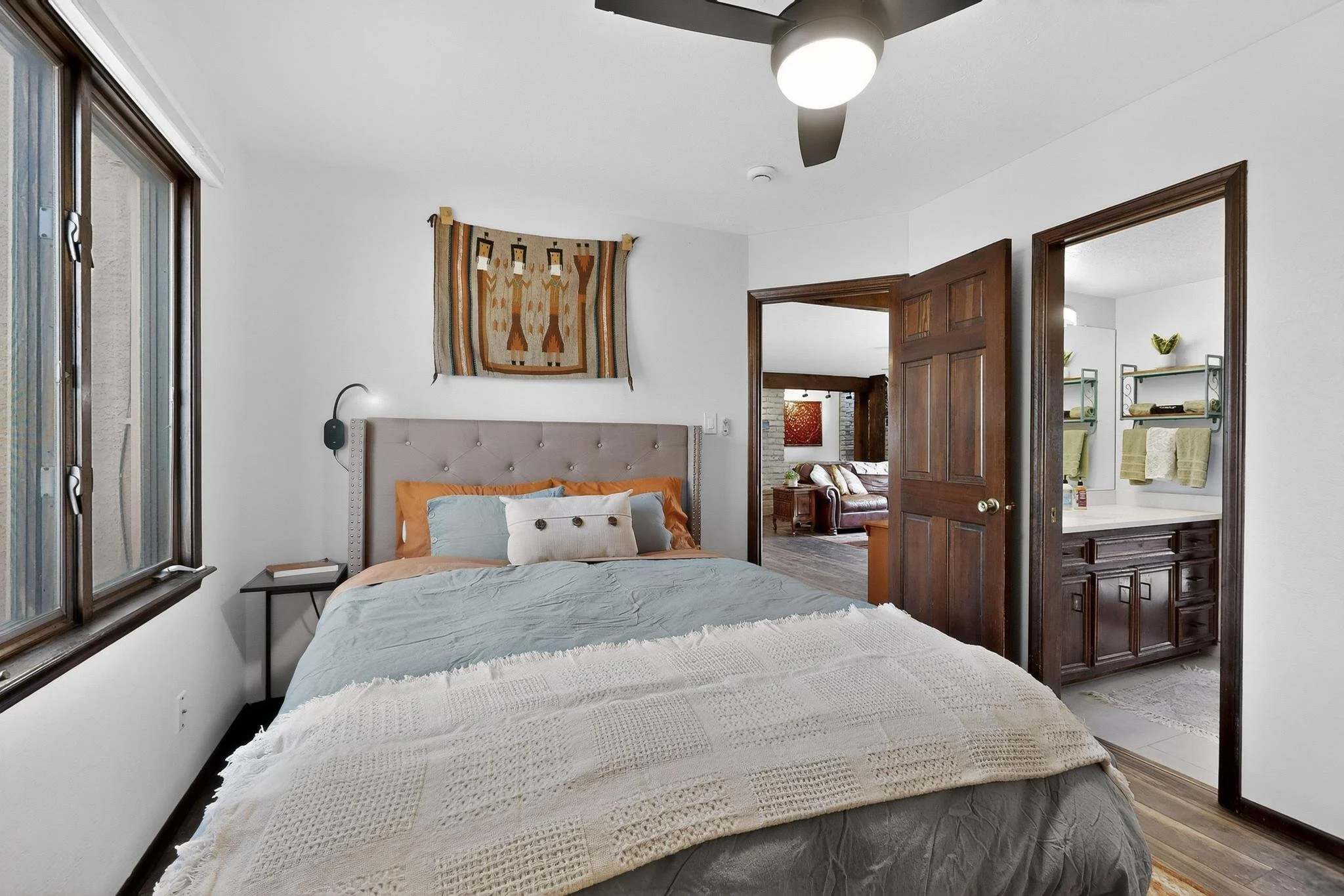 Large master suite with king bed, newly done spa bathroom with soaking tub / walk-in shower, sunrise mountain and sunset city views.